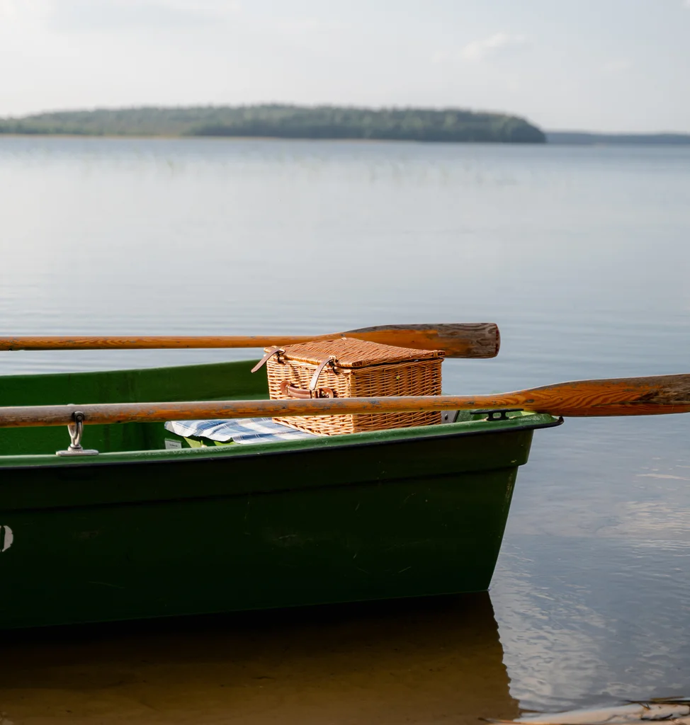 Izbraucieniem pa ezeru, piedāvājam pilnībā aprīkotas airējamas laivas un laivas ar elektromotoru. Aprīkojumā ietilpst glābšanas vestes un enkuri.