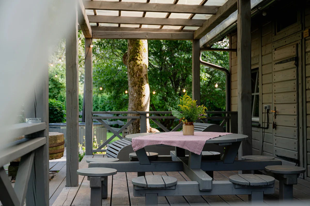 Pie mājas atrodas terase ar galdu un krēsliem, kur iespējams baudīt maltītes svaigā gaisā. Viesiem pieejams arī grils, bet īpašai relaksācijai – baļļa. Papildus iespējams izmantot arī pirti (par papildus samaksu).