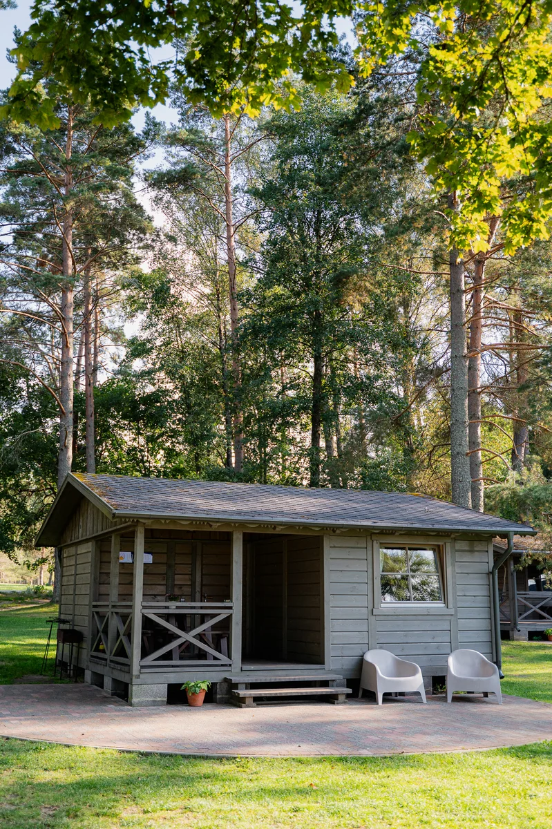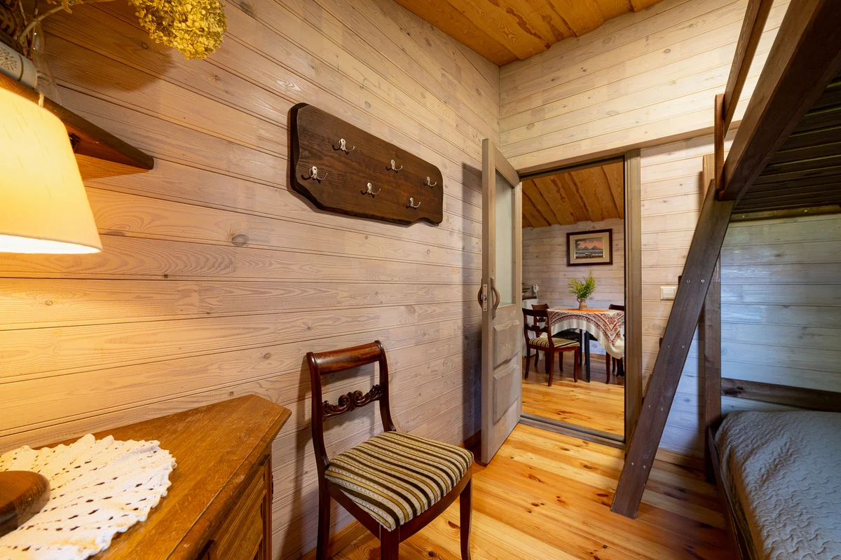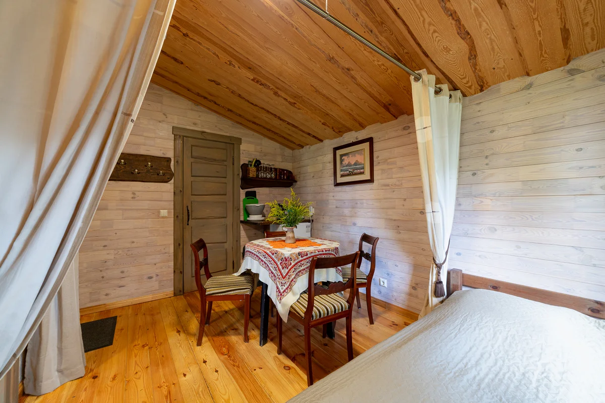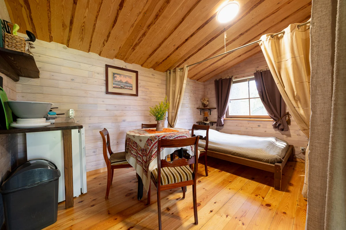 Mājiņa ir aprīkota ar nelielu virtuves zonu, kur pieejama indukcijas plīts, ledusskapis, tējkanna un trauki, kā arī galds un krēsli kopīgām maltītēm. Viesu ērtībām pieejama privāta vannasistaba ar dušu un WC, kā arī fēns.