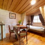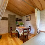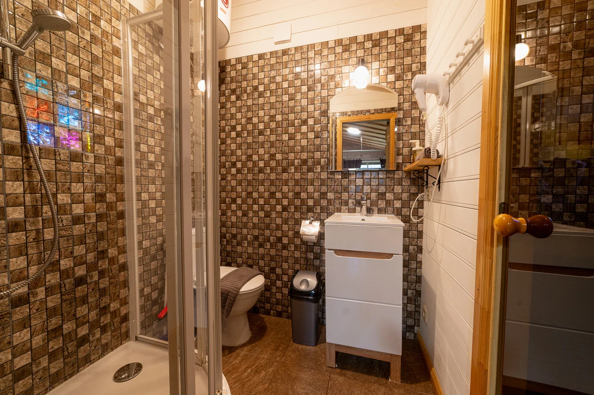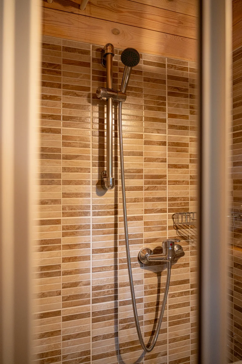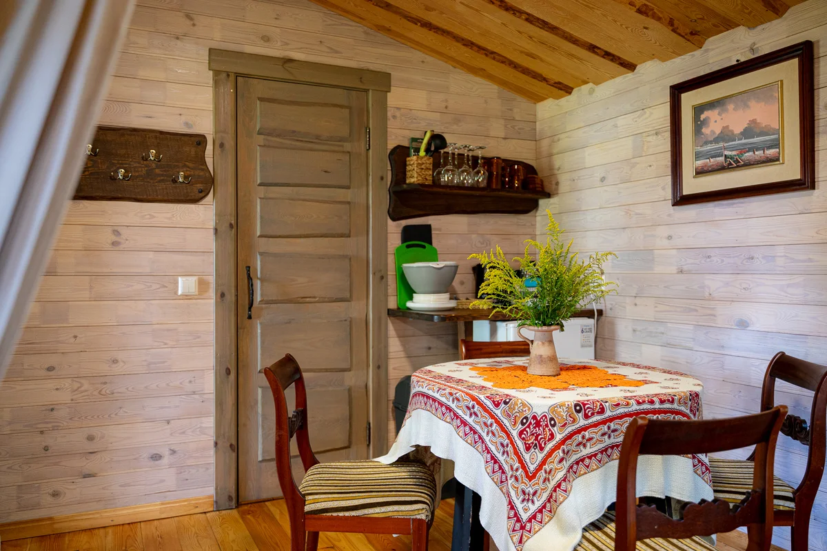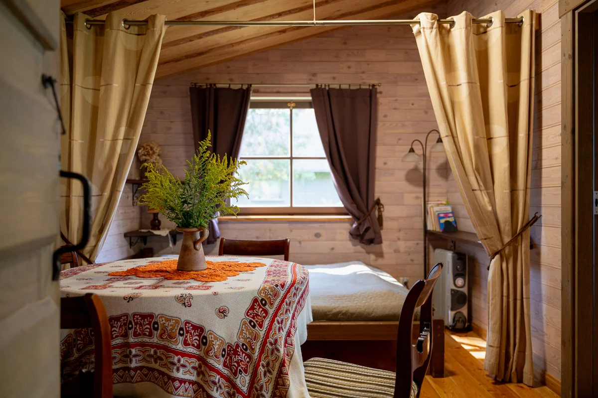 Mājiņa ir aprīkota ar nelielu virtuves zonu, kur pieejama indukcijas plīts, ledusskapis, tējkanna un trauki, kā arī galds un krēsli kopīgām maltītēm. Viesu ērtībām pieejama privāta vannasistaba ar dušu un WC, kā arī fēns.