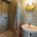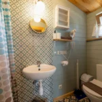 Viesu ērtībām pieejama privāta vannasistaba ar dušu, WC un izlietni, kā arī pilnībā aprīkota virtuves zona ar indukcijas plīti, ledusskapi, traukiem, galdu un krēsliem.