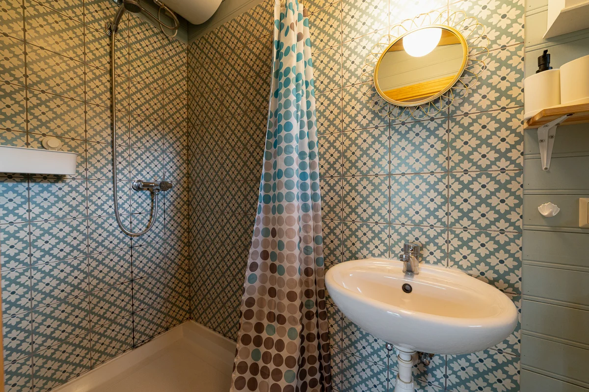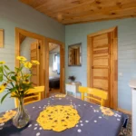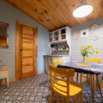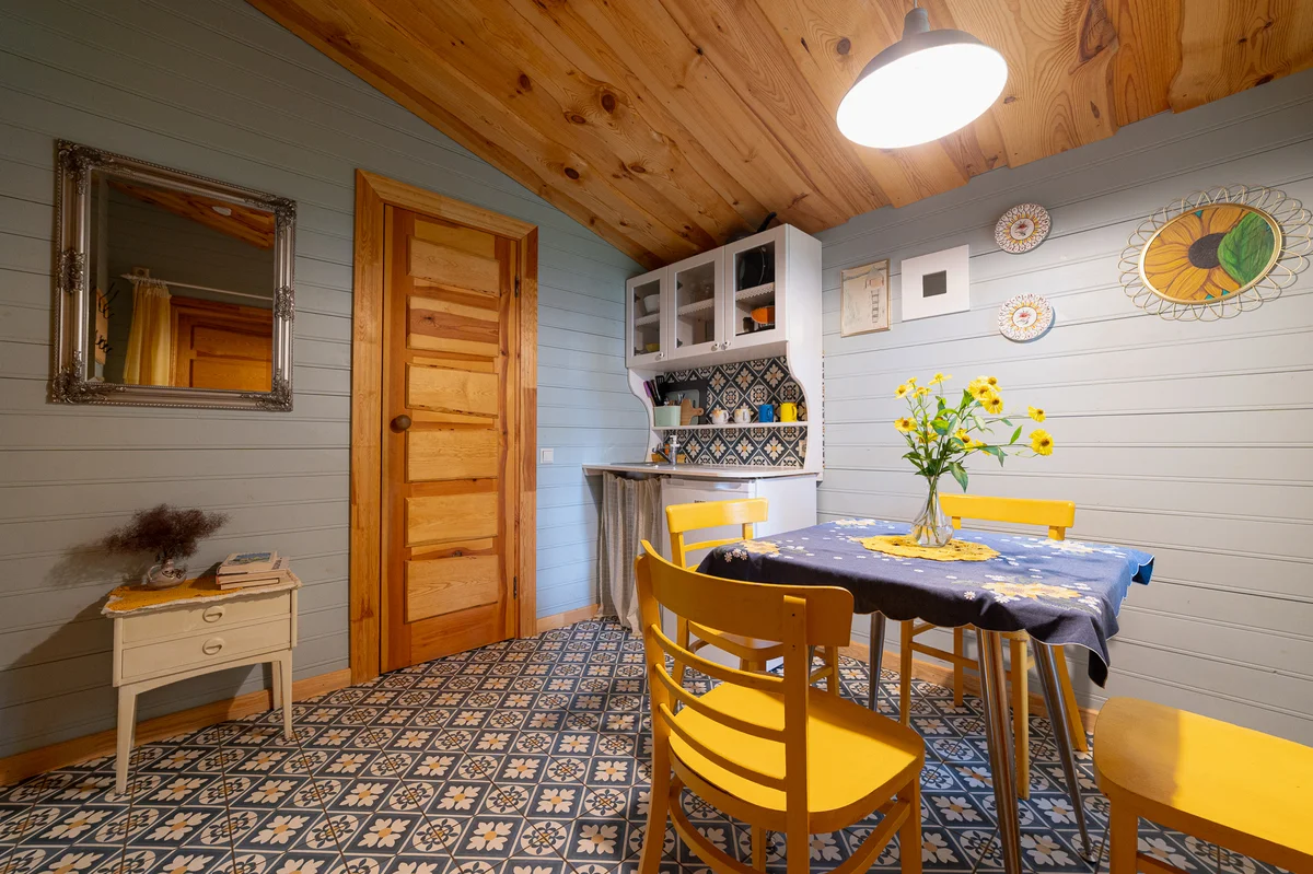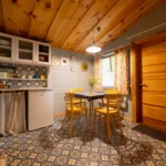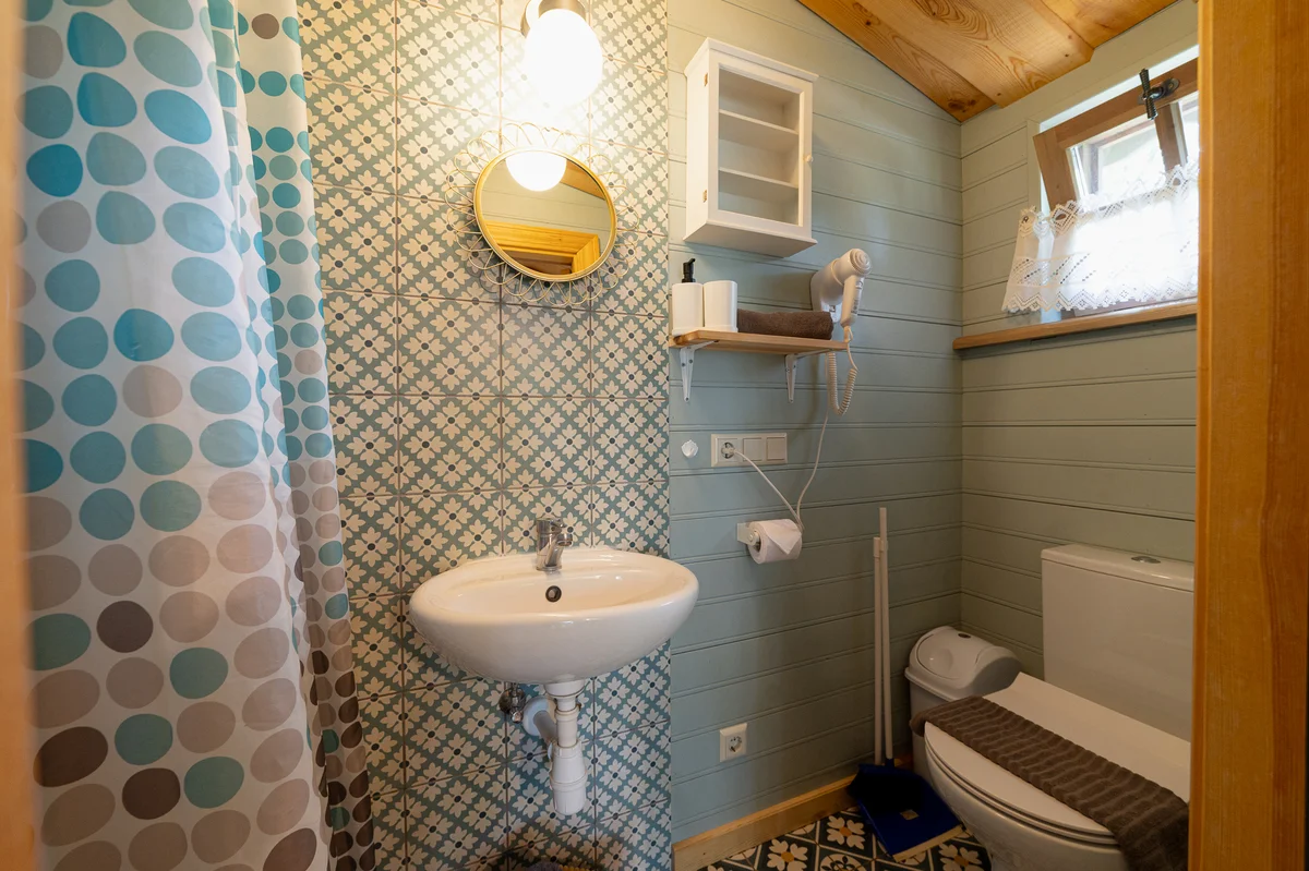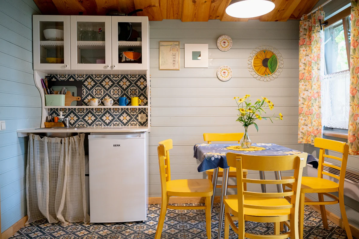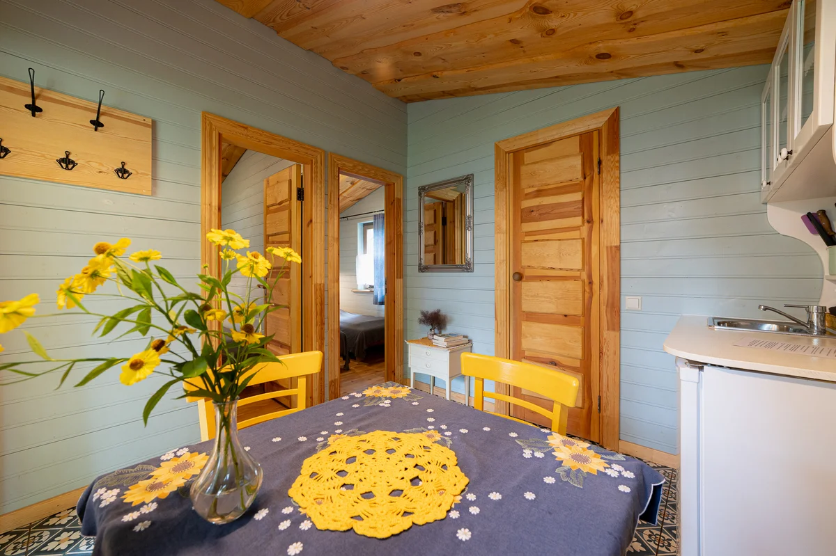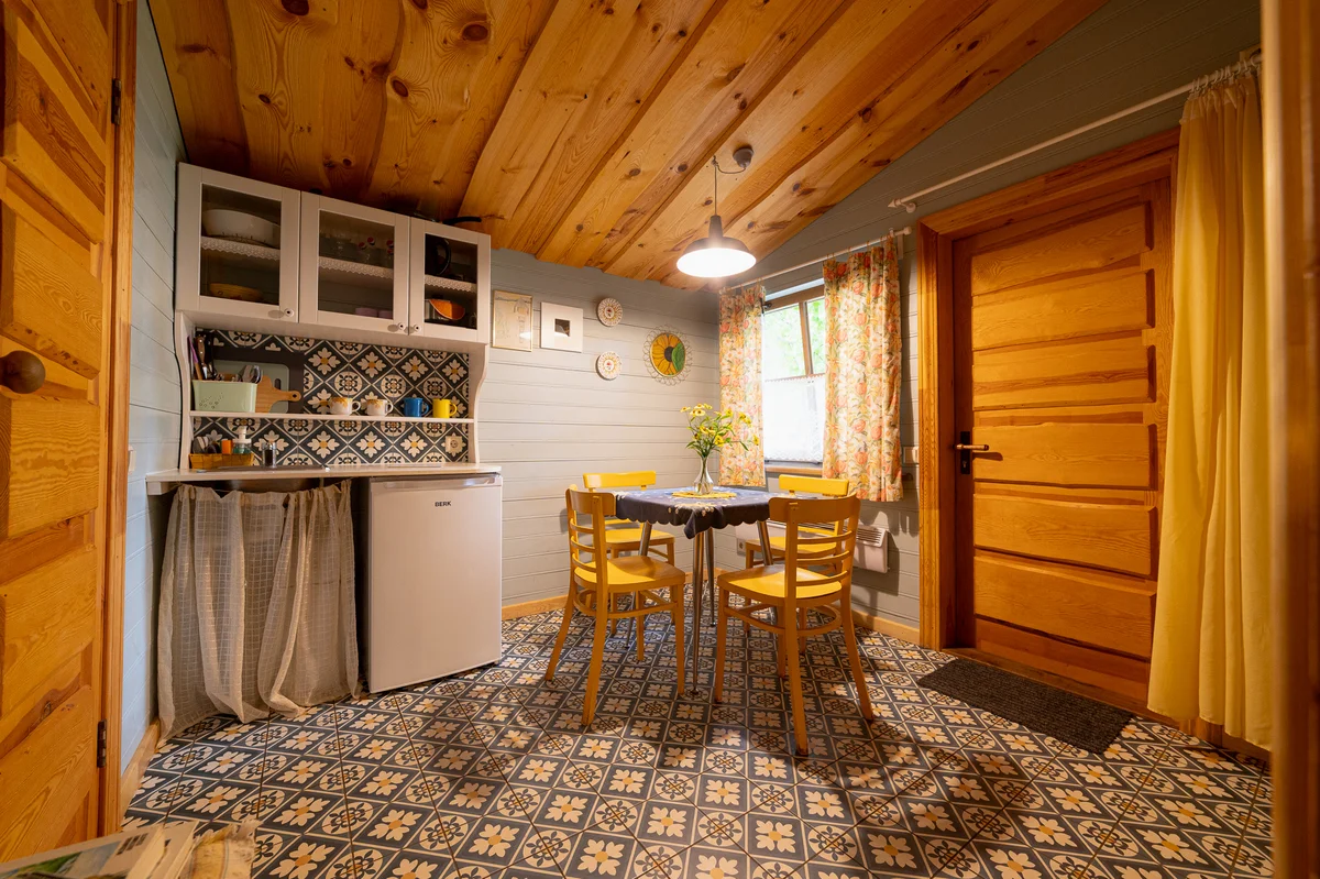 Viesu ērtībām pieejama privāta vannasistaba ar dušu, WC un izlietni, kā arī pilnībā aprīkota virtuves zona ar indukcijas plīti, ledusskapi, traukiem, galdu un krēsliem.